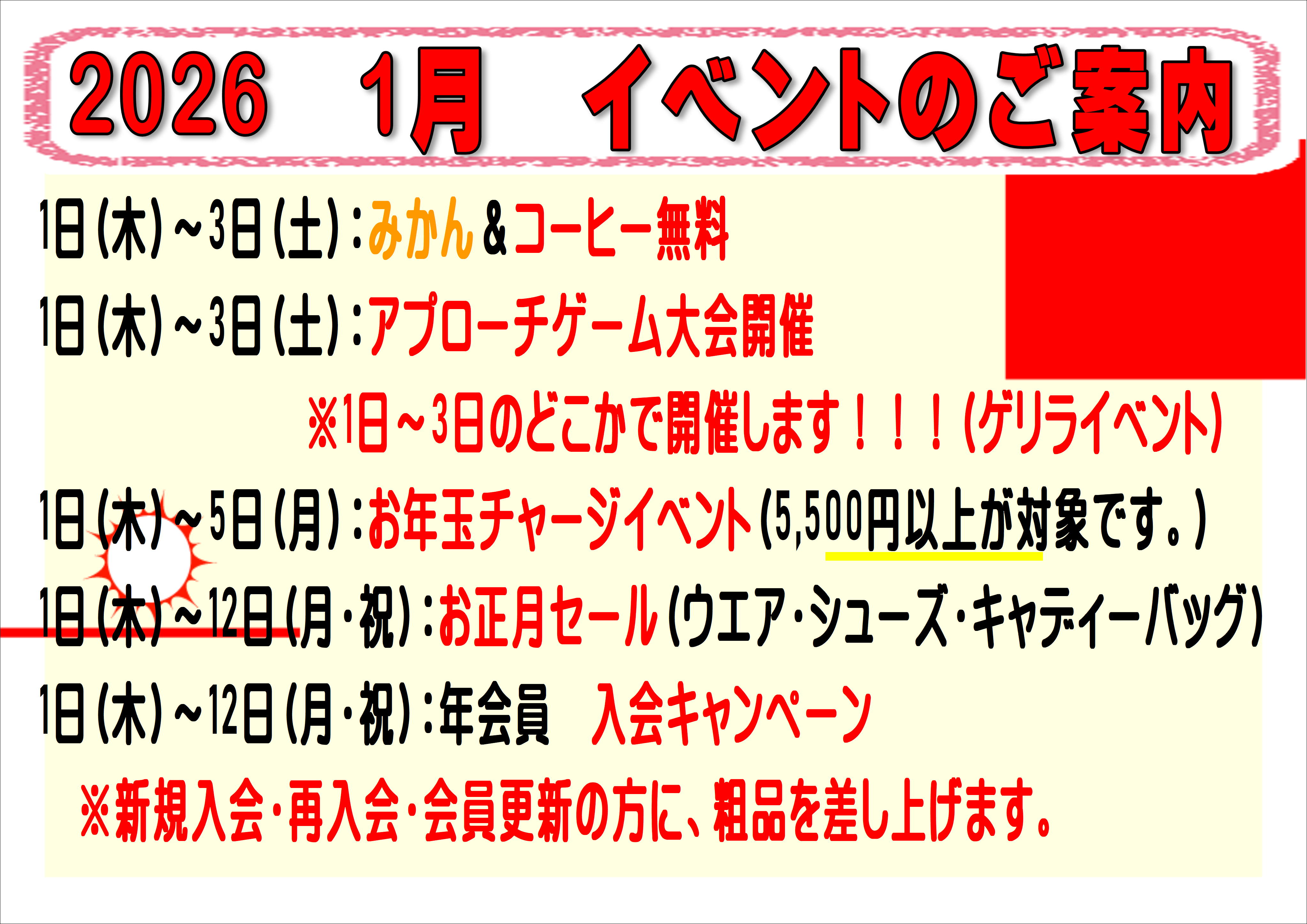 三が日からイベントめじろ押し✨ みかん🍊&コーヒー☕無料、お年玉チャージイベント、お正月セール、アプローチゲーム、入会キャンペーン など