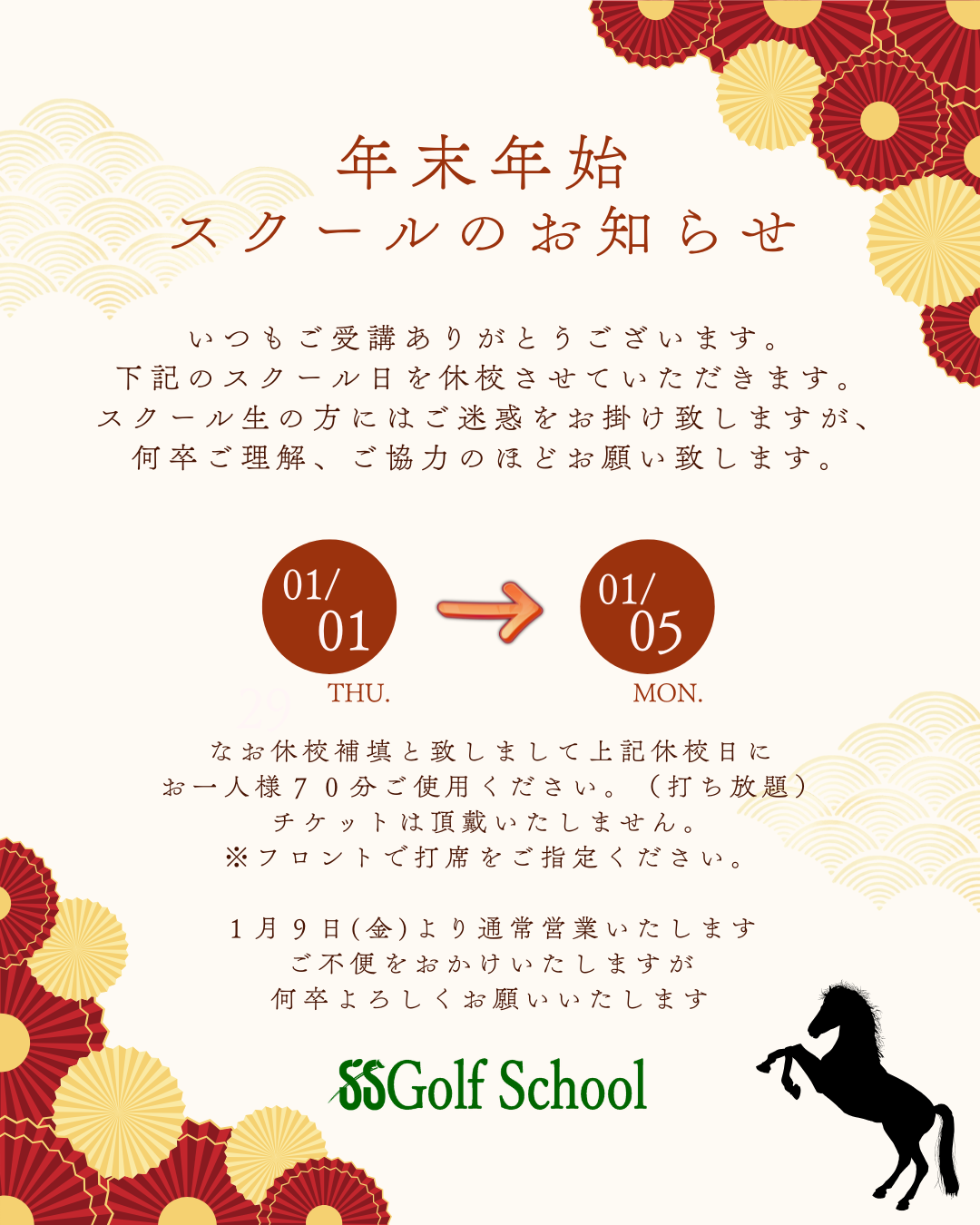 2026年 1月 1~4日 9:00 ~ 16:00 (スクール: お休み)1月 5日(月)~ 10:00 ~ 16:00 (スクール:お休み)